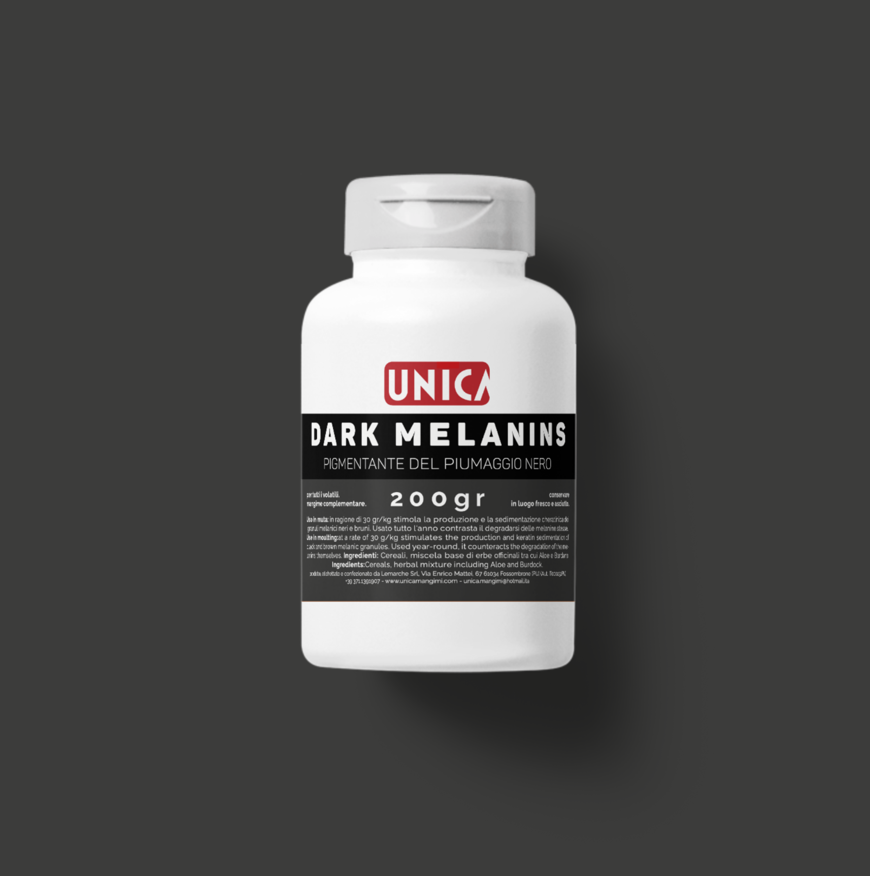 Ciemna melanina jest naturalnym utleniaczem granulek melaniny w upierzeniu melanistycznym. Dark Melanin to mieszanka ziół, korzeni oraz fitoaktywnych ekstraktów, która znacząco wzmacnia i przyspiesza naturalny proces utleniania granulek melaniny w upierzeniu wszystkich ptaków.