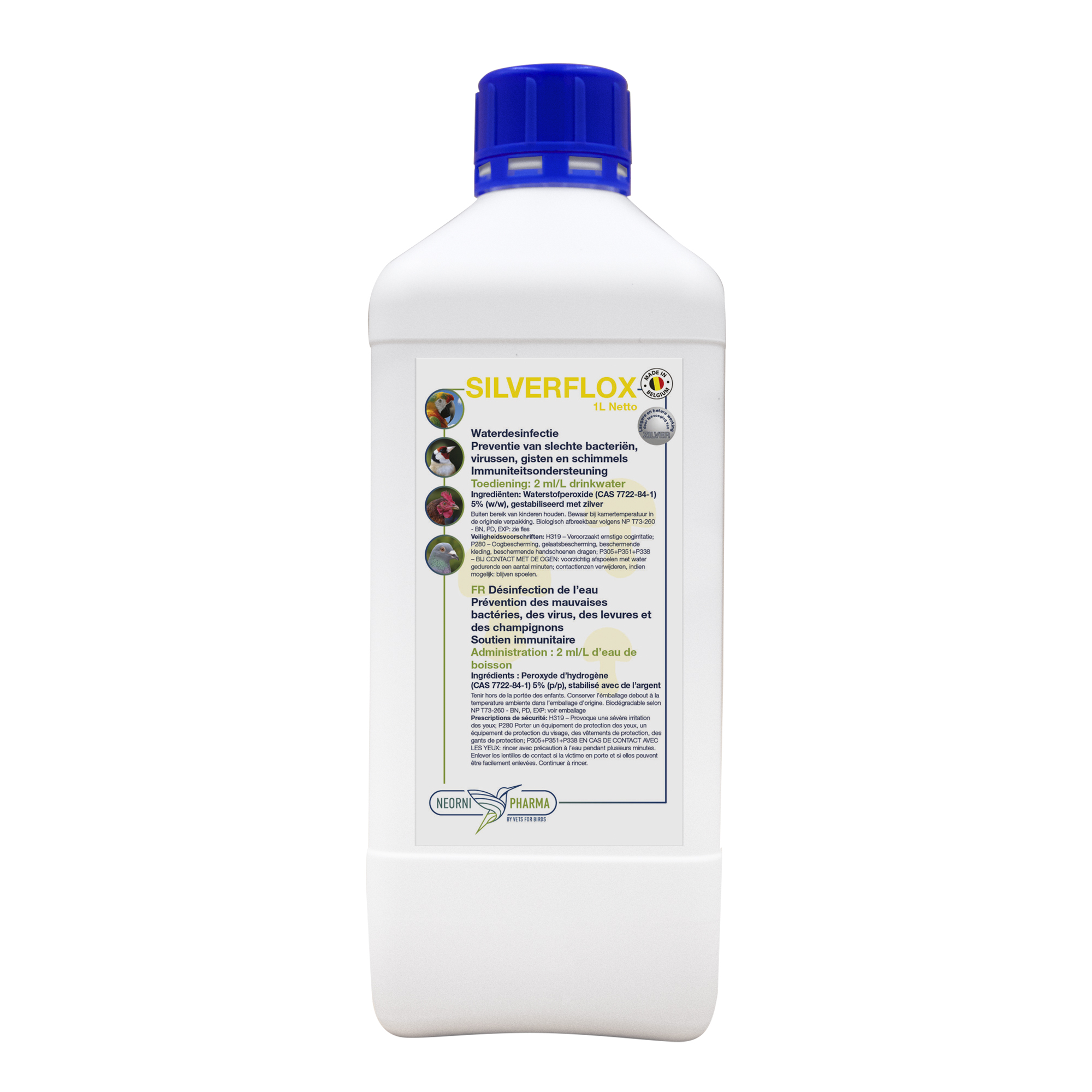 Silverflox zawiera silną formułę z aktywnymi środkami dezynfekującymi, które są skuteczne przeciwko szerokiemu spektrum bakterii, grzybów i innych patogenów. Skład został specjalnie zaprojektowany, aby łączyć bezpieczeństwo i skuteczność zarówno w wodzie pitnej, jak i środowisku życia ptaków.